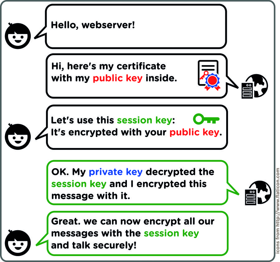 SSL solves this key exchange problem by using an asymmetric cypher to encrypt the symmetric key. Here’s what happens when you access a website secured with SSL.